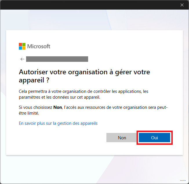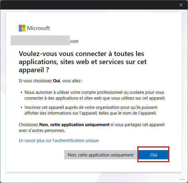 À l’invite "S’authentifier sur toutes les applications et services sur cette machine ?" et "Autoriser votre organisation à gérer votre appareil ?", cliquez sur Oui.
