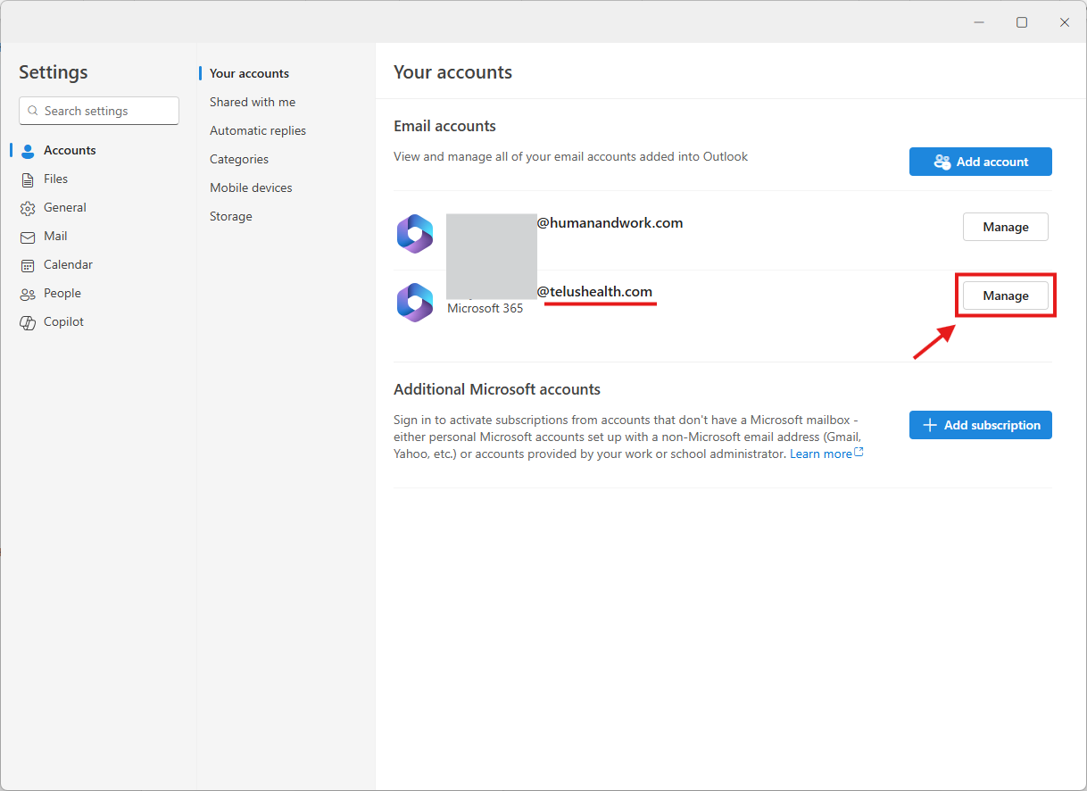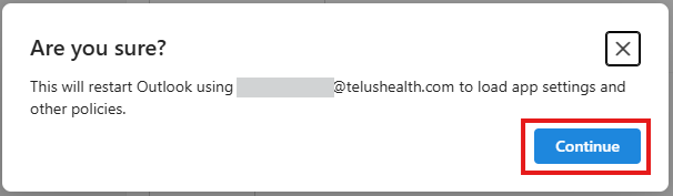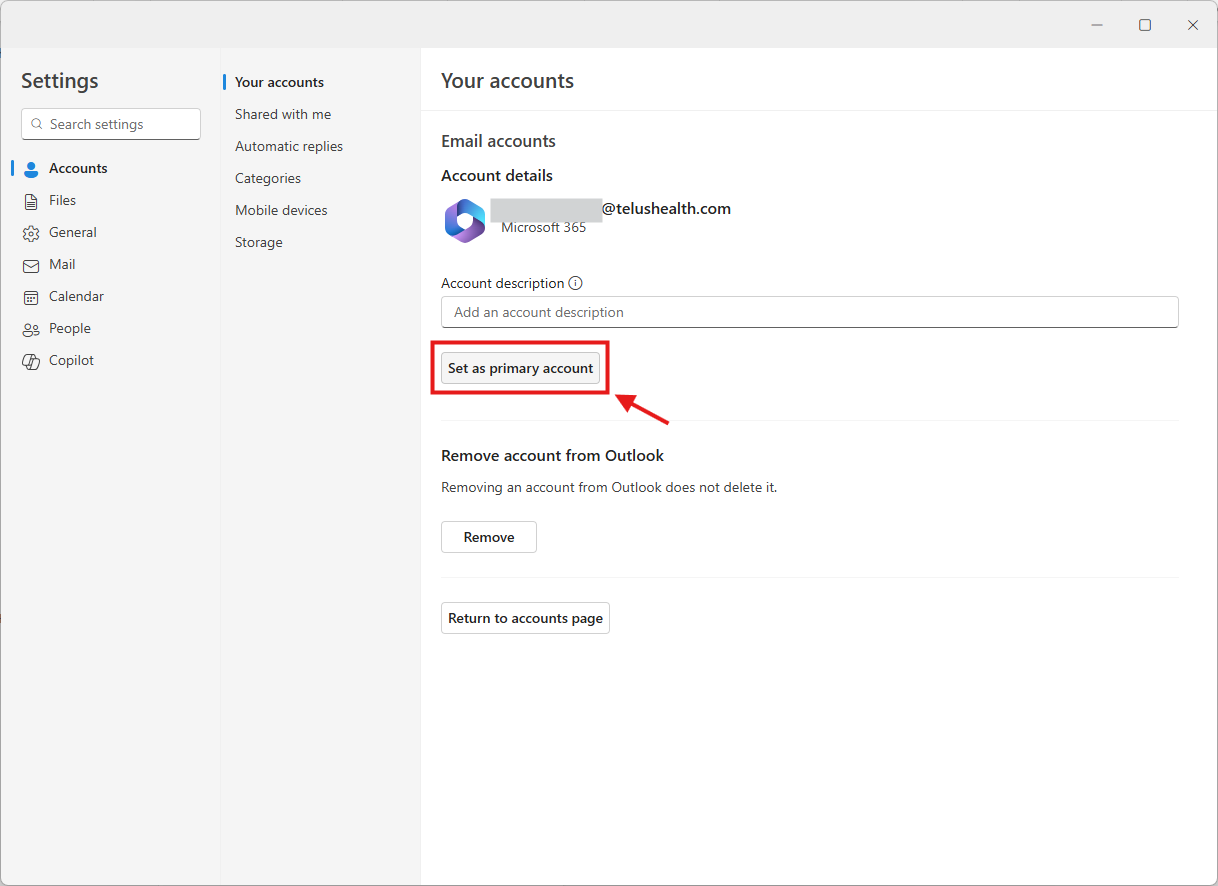 Dans les paramètres d'Outlook, basculez le compte TELUS Health en « Compte principal ».