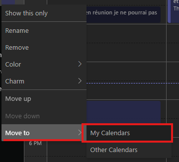 - Le calendrier partagé apparaîtra sur Teams après une petite période de synchronisation. Déplacez ce calendrier vers "vos calendriers" (à faire donc sur les deux comptes) :