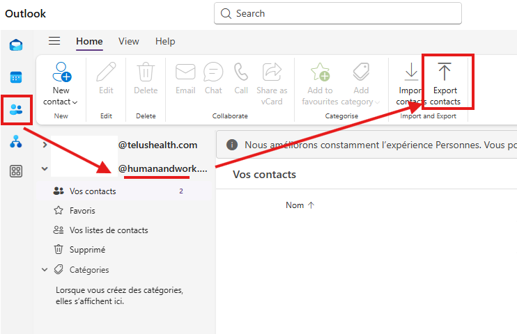 - Ouvrez la partie Contact d’Outlook puis sélectionnez votre compte historique. Dans le menu en haut de vos contacts, vous verrez deux flèches, une pour exporter et une pour importer vos contacts. Exportez vos contacts depuis votre compte historique.