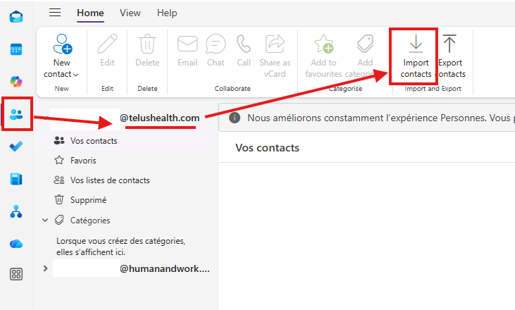 - Sélectionnez maintenant votre compte TELUS Health puis importez le fichier CSV que vous venez de télécharger. L’import peut prendre plus ou moins de temps selon la taille de votre carnet d’adresses.