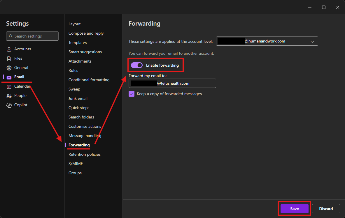 2. Add automatic forwarding with a copy of Human & Work emails to TELUS Health