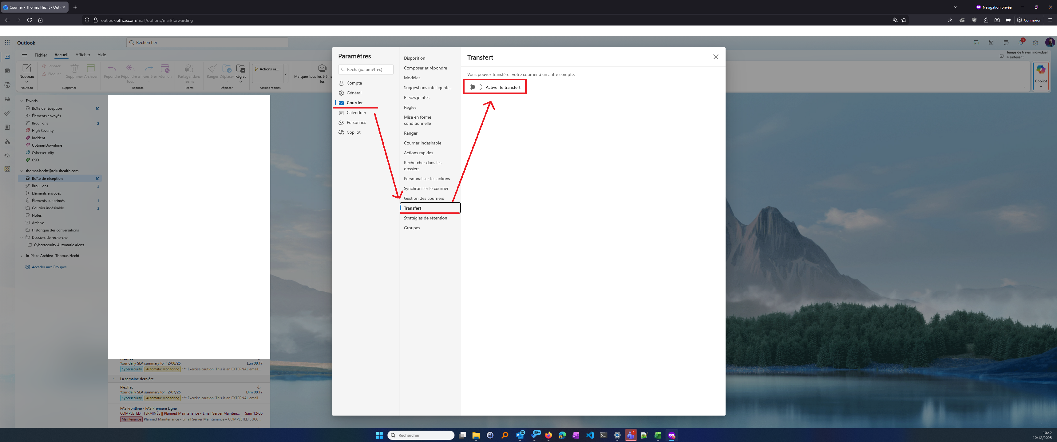 - To view the forwarding configuration on the Human & Work side, click on the link below in a private browsing tab and/or by authenticating with your Human & Work account: https://outlook.office.com/mail/options/mail/forwarding/forwardingOption